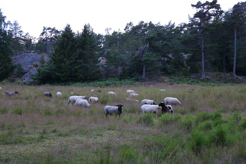 Det går ju inte bara att gå till sängs efter middagen, så vi tog oss en kvällspromenad upp mot Mörkviken, där vägen upp till denna vik passerades genom en fårhage. Finns markerade naturstigar på Fjärdlång så denna väg via fårhagen var inte den enda vägen som man kunde gå, men den var klart snabbast i alla fall. 😉
