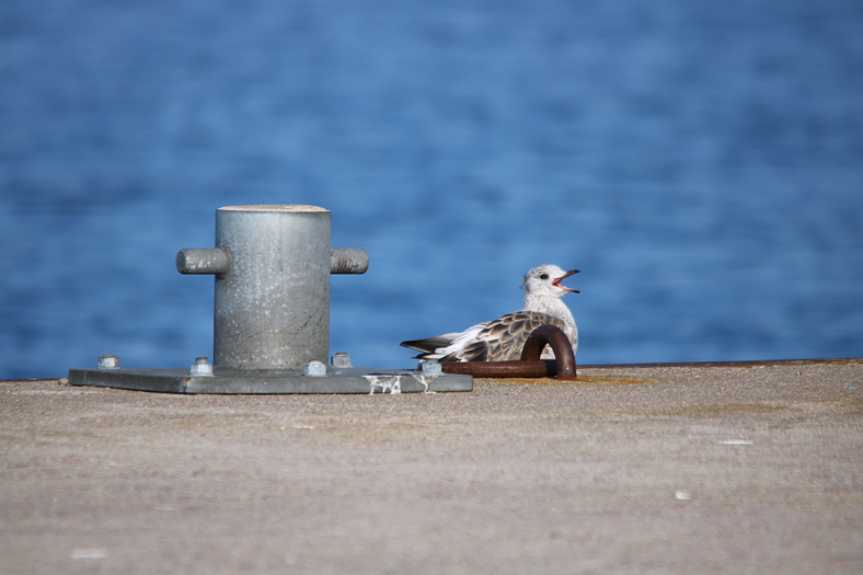 Vaken måsunge. Satte mig på en bänk intill bryggan och kunde konstatera att två måsungar vilade just på bryggan.