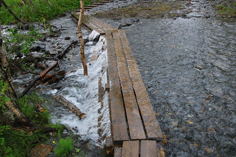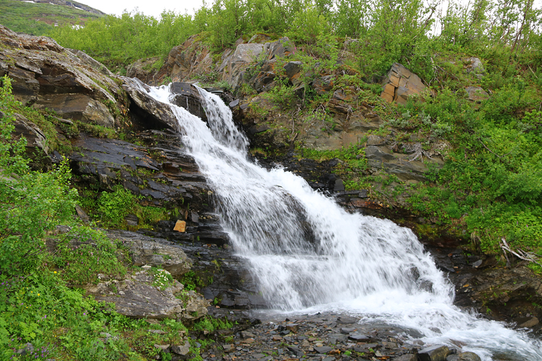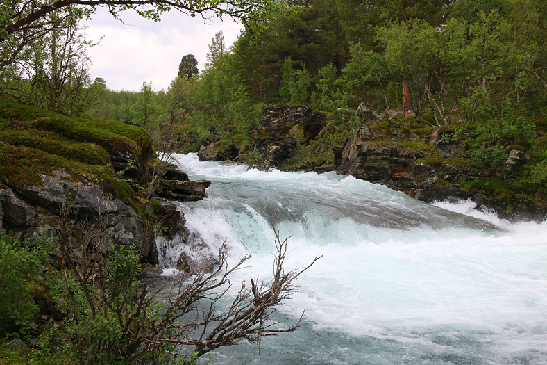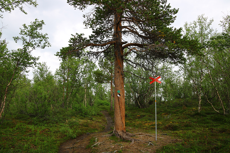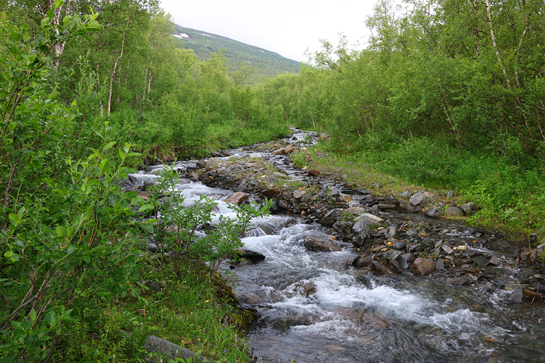 Jag började med att gå till höger här, och ta mig en bit upp på fjället Nuolja, en naturstig längs fjällbäcken Ridonjira. Då det kom att bli fuktigt väder så valde jag att vända en bit upp, och sedan istället fortsätta bort mot Kårsafallen.