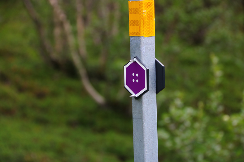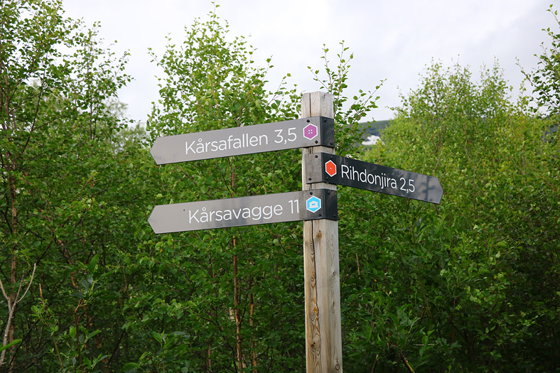 De olika lederna markeras på detta vis, i olika färger då. Detta var färgen på leden bort till Kårsafallen, en naturstig på västra sidan om Abiskojåkka.