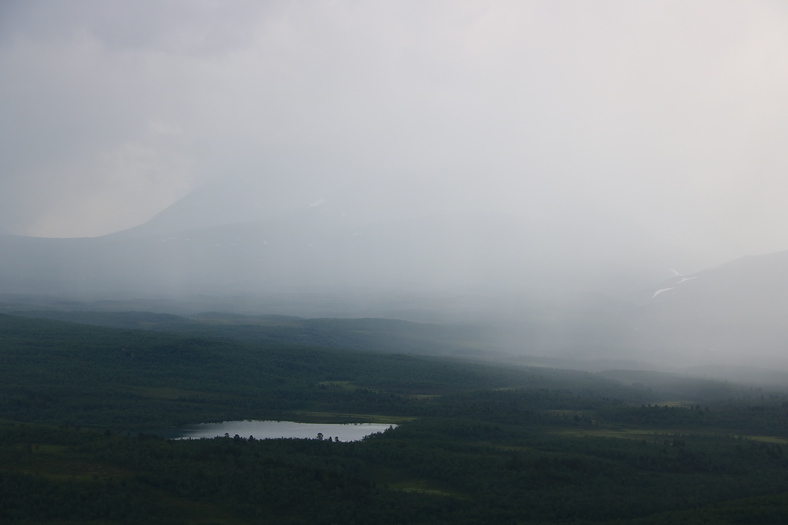 En viss effektfullhet i bild när dimman med lättare regn drog in. Väderomslag är något man ska räkna med vid besök i fjällvärlden.