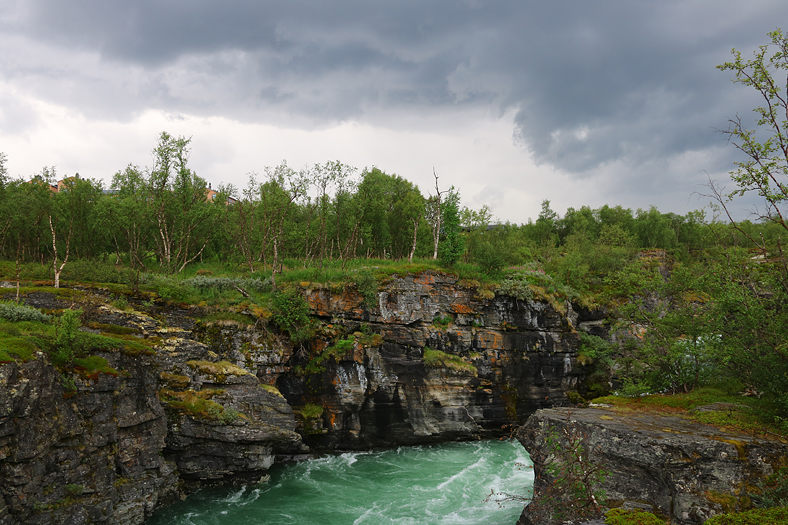 Och så den mäktiga kanjonen med lite mörka moln ovanför. Efter en härlig vandring, om än lite fuktig och lite myggig, ett för övrigt återkommande tema i dessa blogginlägg från Abisko, så tog jag paus på turiststationen en stund på sena eftermiddagen. En måltid i restaurang Kungsleden stod på programmet, bokade tid där i samband med min middagsdesperation dagen innan. 😉
