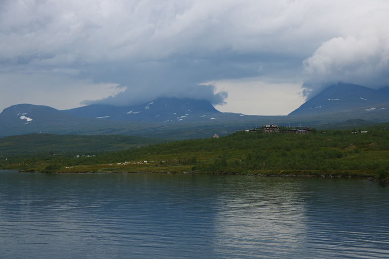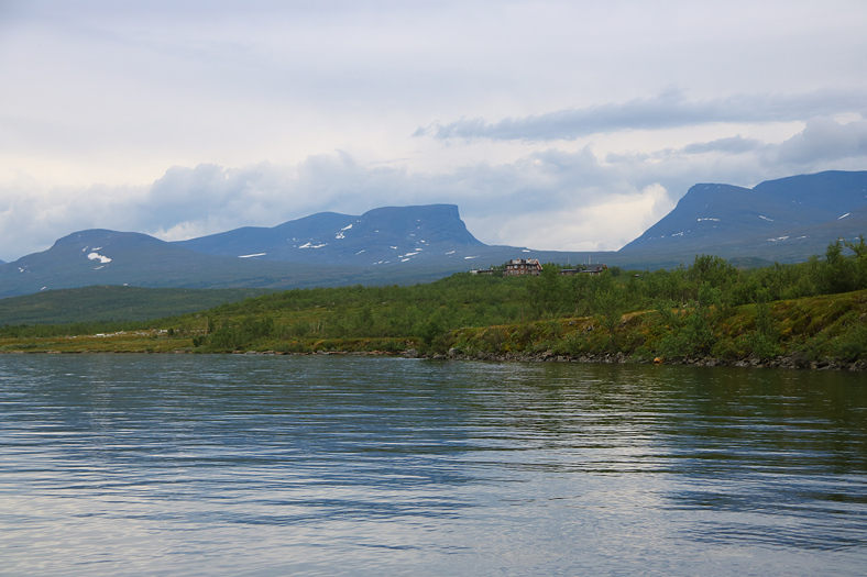 Nere vid strandkanten och vy bort mot bland annat den naturvetenskapliga stationen, som syns på höjden mitt framför Gåsdalen/Tjuonavaggi i bilden. Detta är en forskningsstation som funnits i mer än 100 år och som inriktas på forskning gällande subarktiska miljöer samt klimatförändringar. Till denna forskningsanläggning så ryms även ett 50 hektar stort naturreservat, som då ligger i gränsen till nationalparken.