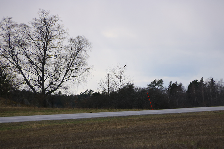 Och möjligtvis var det den ormvråken som satte sig i detta träd mitt över vägen, för att se om något smaskigt kunde dyka upp i vägdiket. Ormvåk kan man ofta se sitta längs vägar för att spana efter smågnagare exempelvis.