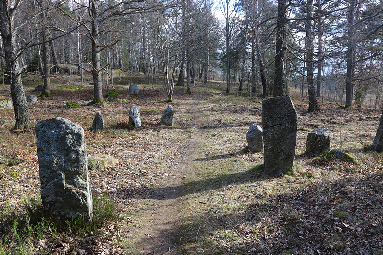 Fornlämningar är inte ovanliga i trakten, utan snarare finns det gott om fornminnen. Här ett gravfält inte så långt från rastplatsen ovan, dvs rätt nära Bergaholms gård, och ingår också i Bergaholms gravfält. Det finns en östra och en västra del – det här är den östra med 125 fornlämningar i marken, som ska vara från järnåldern.