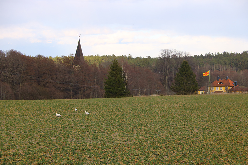 Vid Fågelsta kom jag ut från naturstigen och kom sedan att gå längs Bergaholmsvägen, bort mot Salems kyrka. På åkern intill Salems kyrka höll några sångsvanar till.