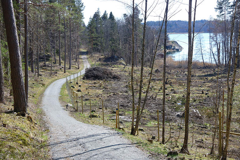 Tråkigt nog har Häringe drabbats svårt av angrepp från granbarkborren, en insekt som i sig är ett naturligt inslag i skogarna, men med de torra somrar vi haft på sistone ökat ganska ordentligt vilket givit den tråkiga följden att stora mängder granar dör. För att det hela inte ska sprida sig än mer, och att inte de döda granarna ska göra områdena osäkra av träd som kan falla, så har man tvingats göra en så pass drastisk åtgärd som att avverka ganska mycket skog i Häringe. Inte bara Häringe för övrigt, flertalet andra naturreservat som Skärgårdsstiftelsen förvaltar har tvingats till liknande åtgärder. Inhägnaden som syns är för att skydda den nyplanterade skog, lövskog i detta fall, som så småningom ska pryda området, och skyddet är ju då kanske främst mot områdets vilda djur. Det här är ett område där mycket vilt går.