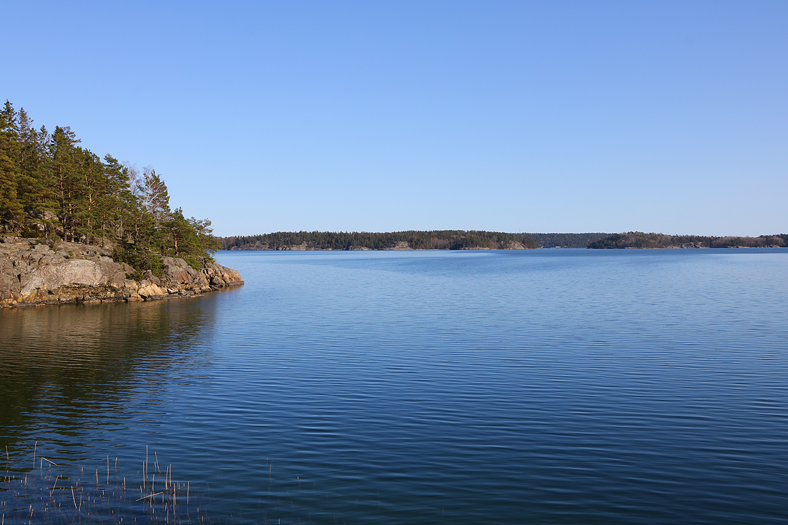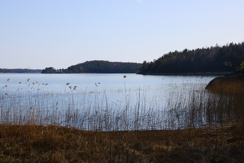 Efter lite skogspromenad så nådde jag fram till strandkanten, som skärgårdsdiggare vill man ju gärna ha sjökontakt. 😉 På håll syns kranar vid Norvik, den nya hamnen i Nynäshamn. Norvik tog ju över Frihamnens del gällande containertrafik, så nu körs inga containerfartyg till centrala Stockholm.