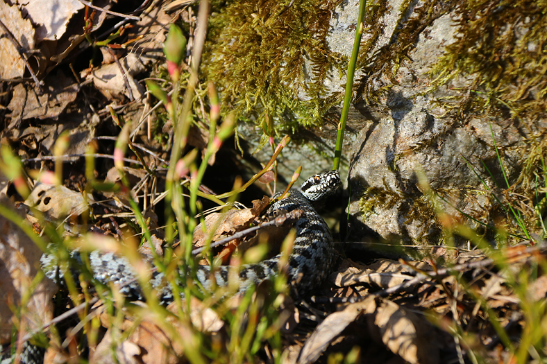 När man vandrar i naturen så gäller det att vara på ”hugget” så att säga, så man inte själv råkar ut för ett hugg av denna slingriga typ. 😉 Men med långbyxor och rätt ordentliga vandringsskor så är inte den risken särskilt stor, går man barfota i sandaler ska man väl dock vara lite mer observant i ormtäta ”kvarter”. I alla fall var detta en vacker huggorm i gråblå nyans och med det typiska zickzackmönstret. Ser man en orm med gulvita fläckar vid huvudet så är det inte en huggorm, utan den giftfria snoken.