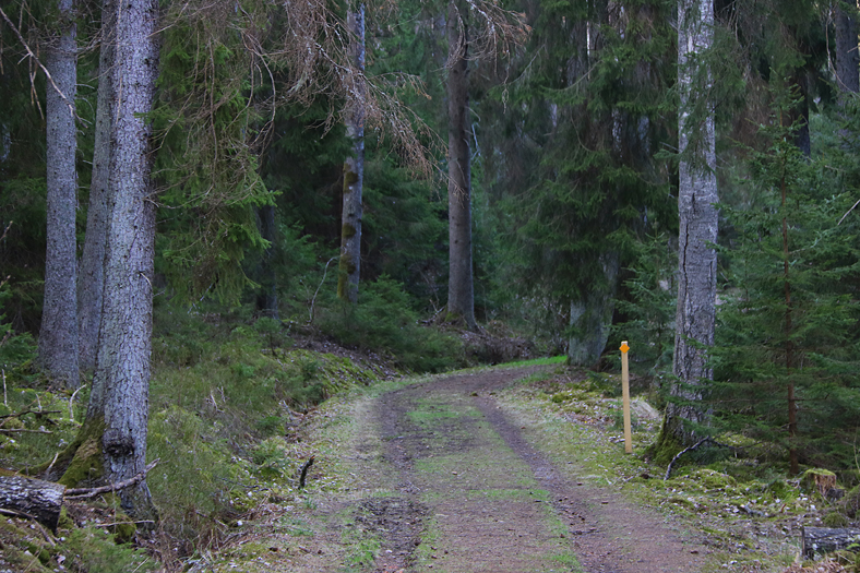 Det är den här mörkgröna färgen man vill se i granskog, inte den brungråa som de torra barren på döda granar bär med sig. Från Häringenäs gick jag en väg som ledde genom en hel del skogspartier, upp mot Bobäcken. Längs denna väg kan man på ett ställe ta en avstickare upp mot en fornborg och rastplats, men detta gjorde jag ej denna dag.