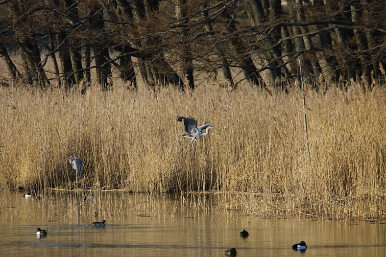 Så landar en gråhäger i vassen, intill en annan häger, framför en del vigg.