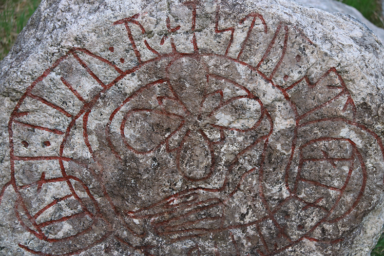 Strax efter Ormbacka, på väg mot pendeltågsstationen i Barkarby, så passerade jag två runstenar varav bilden visar ena stenens motiv och tecken.