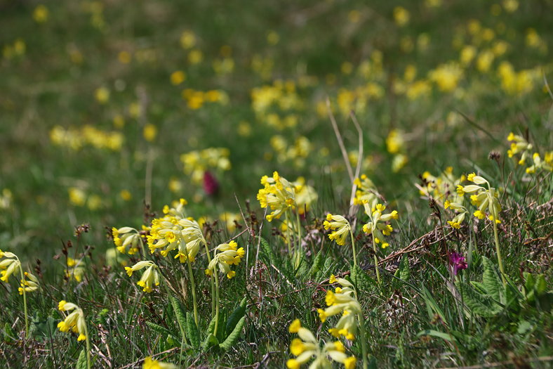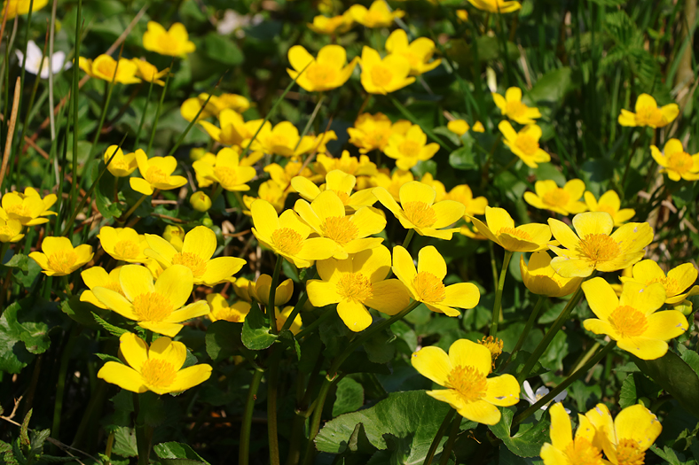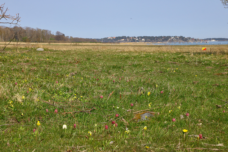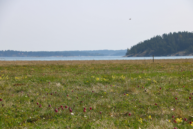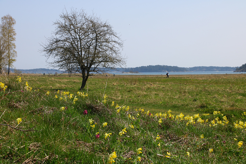 När man kommer ut mot strandängarna så öppnar sig ett hav, inte bara skärgårdsvattnet i bakgrunden, utan också ett hav av kungsängsliljor, gullvivor och vitsippor bland annat.