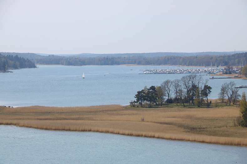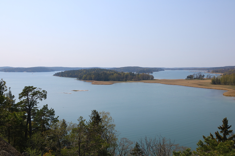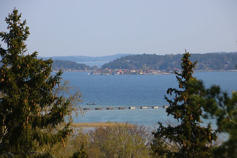 Från andra sidan av berget så kunde man mellan träden se bland annat Jutholmen som ligger precis utanför Dalarö. Står man nere vid Hotellbryggan så har man vy rakt ut mot denna tätbebyggda ö.