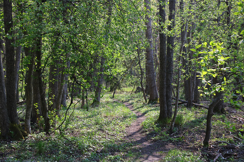 Längs stigen är det lite snår och lite mindre ängar där man får en första blick av en av områdets karaktärväxter – kungsängsliljan.