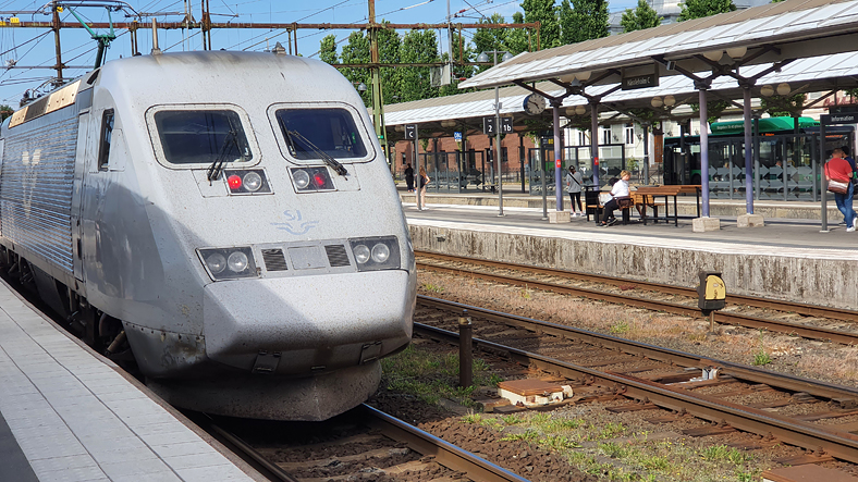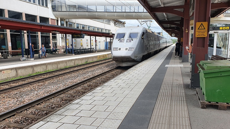 Äntligen kommer tågskrället, tänkte man…Frustrationen hade gjort sig till känna när klockan var närmare kvart över tolv när SJ:s snabbtåg X2000 kom till perrongen. Nu kom det hela att sluta bra då man dels hade kommunikation mellan tågen, och sedan att tåget körde in en del tid mellan Skövde och Göteborg. Så väl framme för tågbyte så var marginalen trots allt 5 minuter. Då var detta tåg inget tågskrälle längre. 😉