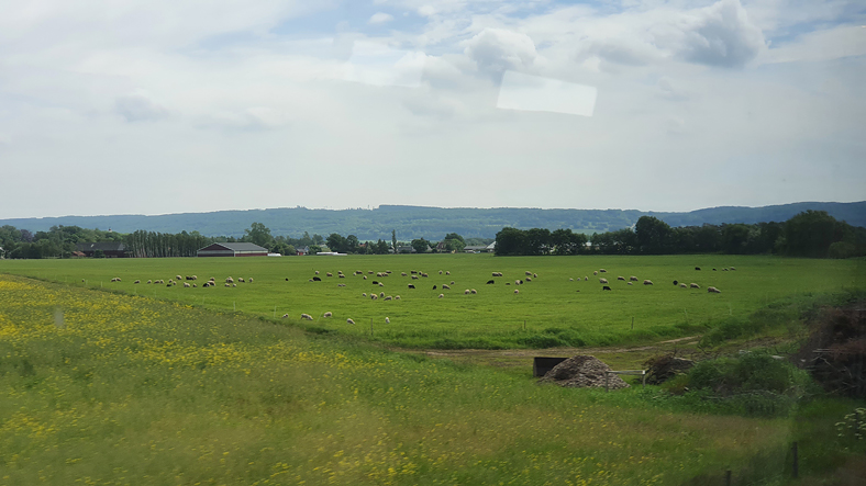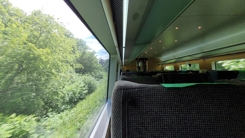 Väl på nästa SJ Snabbtåg, denna gång SJ 3000, var det bara att njuta av färden på Västkustbanan söderut. På bilden syns en välkänd ås i bakgrunden – Hallandsåsen.