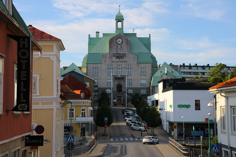 Vi nådde Strömstad, i Bohusläns norra ände, framåt 19-tiden. Förvisso ingen försening på så vis genom att fått åka via Göteborg. Hade huvudplanen varit i funktion så hade vi kommit fram ca 19:30. Vårt hotell låg mitt i staden, Hotell Krabban på Södra Bergsgatan. I två nätter skulle vi bo där. Från Östra Klevgatan, som hotellet också vätte mot, hade man vy mot stadshuset i Strömstad – en mäktig byggnad i granit från 1910-talet.