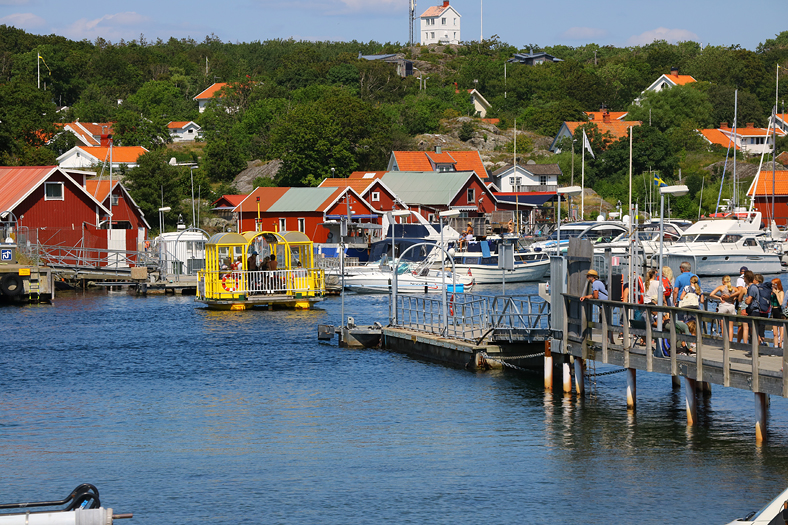 En länk mellan Nordkoster och Sydkoster finns i denna gula lilla linfärja, som just kallas Kosterlänken. För en viss avgift kommer man över sundet. 12 passagerare var maxantalet ombord, så det blev till att köa lite grann innan den långa överfarten. 😉 Färjan är bemannad under sommarmånaderna medan under lågsäsong så får lokalbefolkningen själva köra färjan över sundet – och därmed finns inte någon direkt tidtabellstrafik.