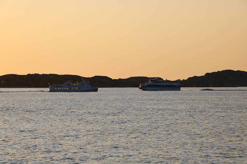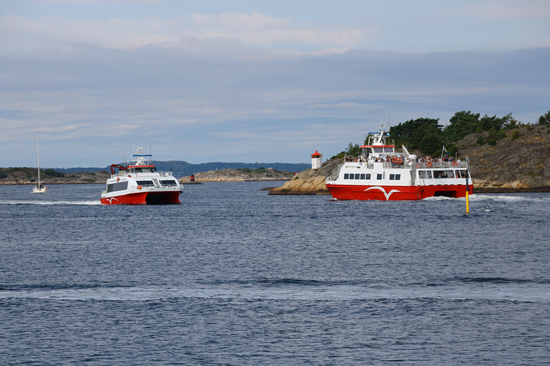 Skärgårdsbåtsmöte vid Rivö. En av Styrsöbolagets katamaraner bär namnet Rivö men i denna bild var det Valö som kom att möta Skarven. Vi valde dock denna afton att åka en betydligt lugnare båt. 😉