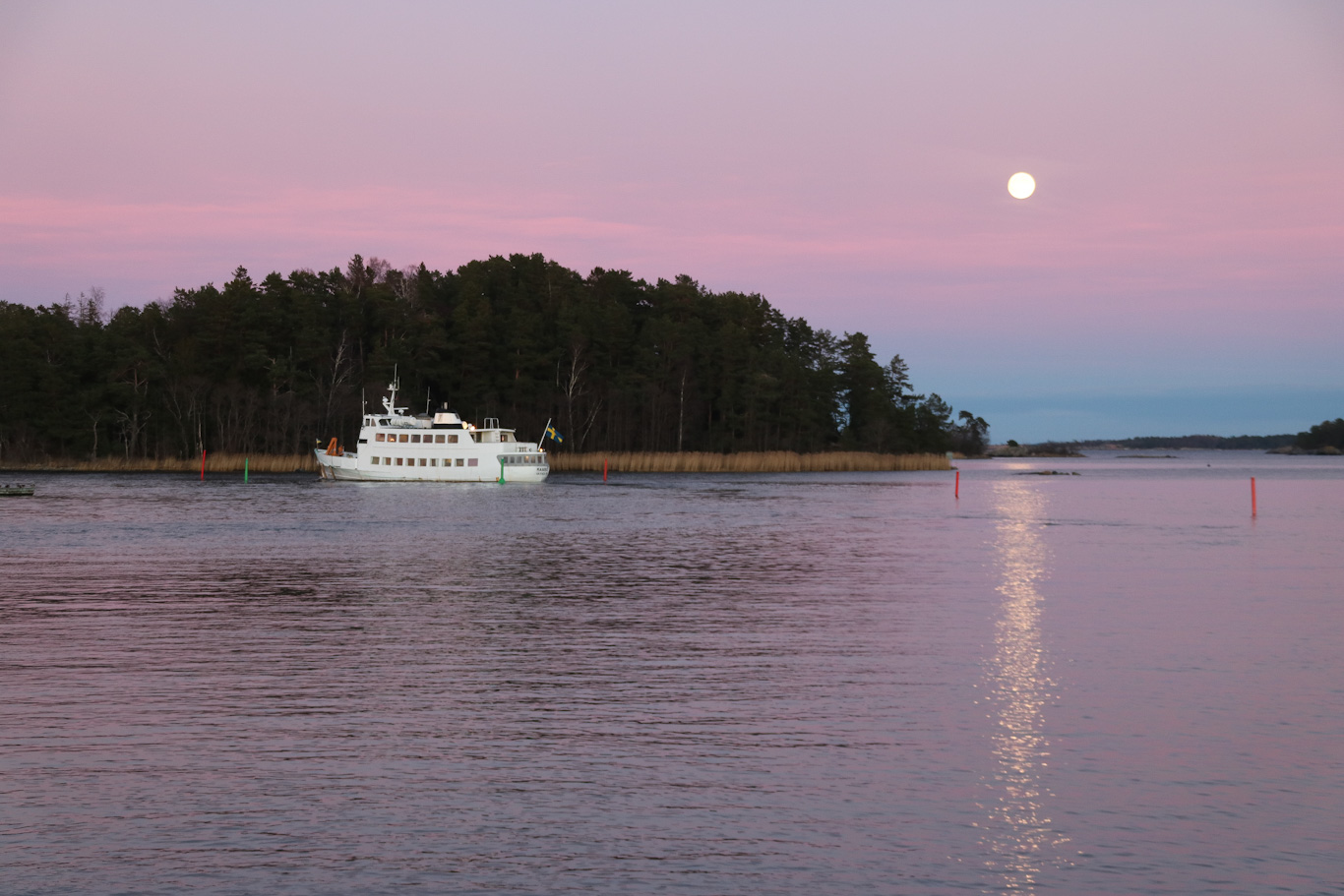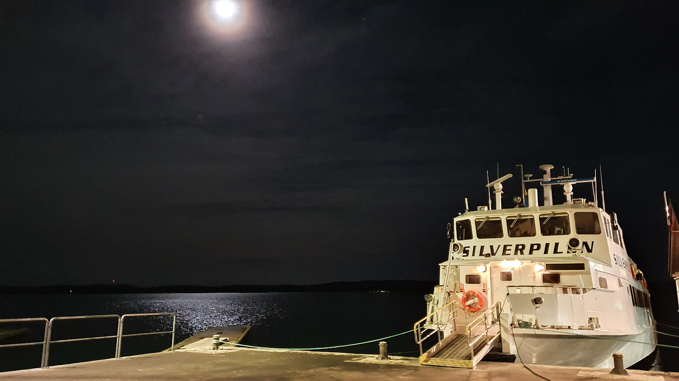 Tillbaka på fastlandet då i månskenet. Silverpilen, den ordinarie båten över Mysingen under vår, sommar och höst. Från Årsta blev det sedan buss tillbaka till Västerhaninge och sedan pendeltåg norröver. Till en utskärgårdsmiljö som Utö är så går det ju relativt fort att ta sig dit ifrån centrala Stockholm, 2 timmar.