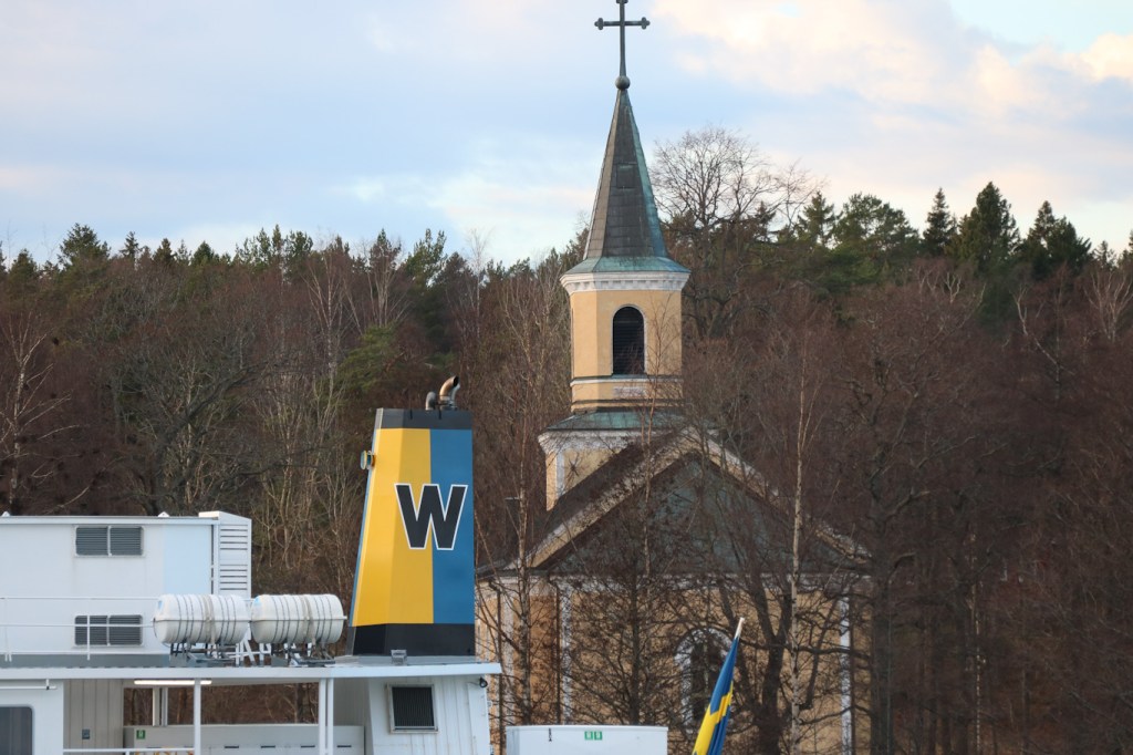 Utö Rederi, det lokala båtrederiet som grundades 1994, dessförinnan fanns Utö Sjötaxi, köptes häromåret upp av Blidösundsbolaget/Transdev, en storvinnare av skärgårdstrafikens senaste upphandlingar då de har vunnit trafik i såväl norra, mellersta och södra skärgården. Och bland fartygen som de då sköter drift och bemanning över är Waxholm II med denna ganska så egendomliga design av Waxholmsbolagets klassiska rederimärke. I bakgrunden är det ju då Utö kyrka, vackrare än Waxholm II kan man väl lugnt säga, belägen några hundra meters gångväg från Spränga brygga. I Kyrkviken finns en till trafikbrygga i Näsudden.