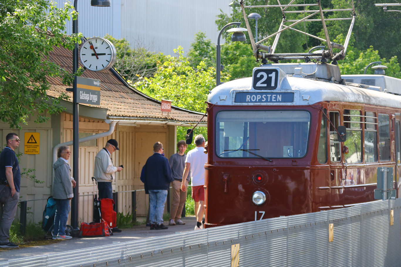 Jag skulle ta båtlinje 80 in från Ropsten till Nacka Strand för att åka ut till Vaxholm den 4 juni, men så kom denna veteranspårvagn på Lidingöbron och jag ändrade destination och färdmedel omedelbart. Det blev spårvagn ut till Gåshaga medelst denna äldre modell.