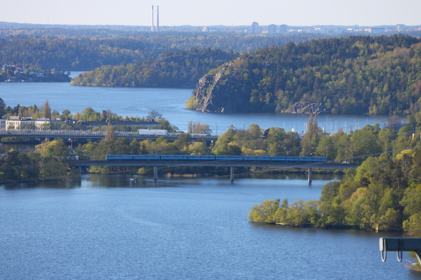 Utsikt över Albysjön och Mälaren, samt vy över ett Cx-tåg på Röda linjens tunnelbana. Cx är beteckningen på de äldsta vagnarna i tunnelbanan, som inom sin tid kommer vara historia. Bilden är tagen från Flottsbrobacken den 17 maj, och jag promenerade från Fittja till Masmo.