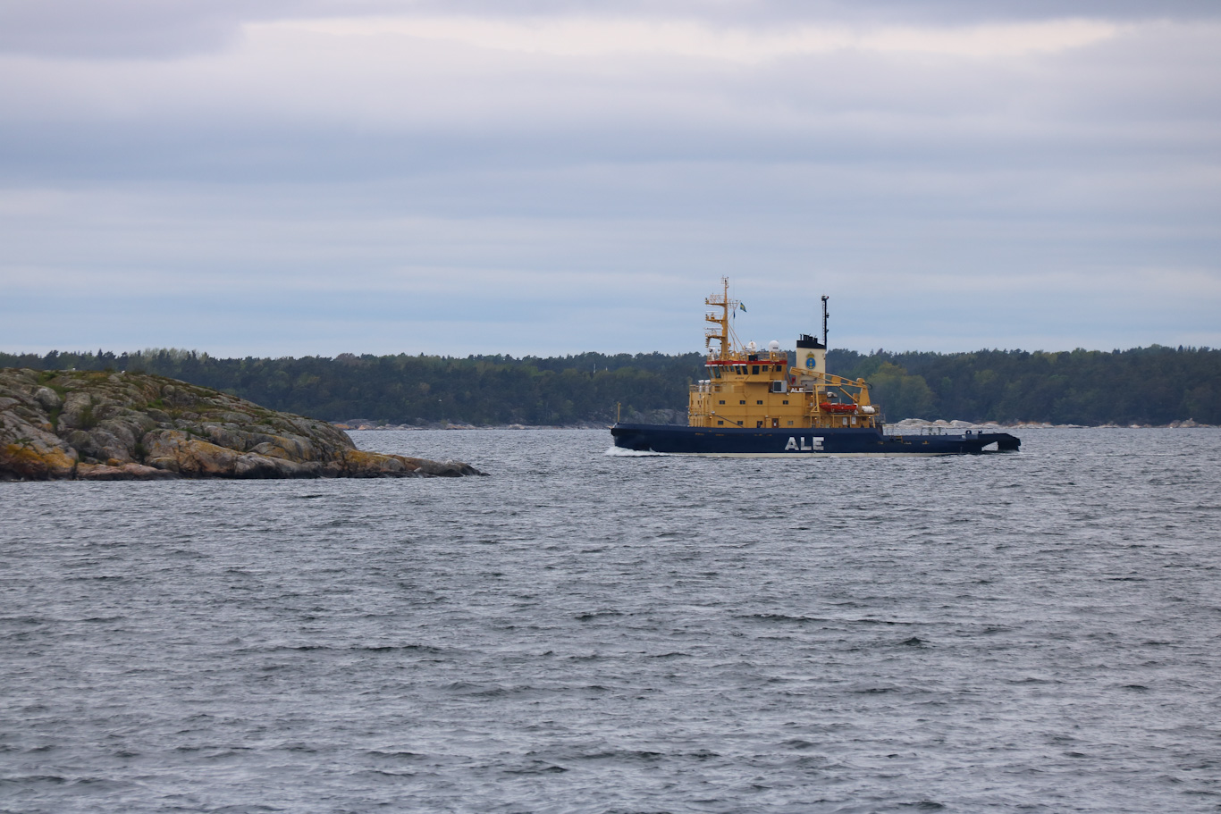 Jag nämnde tidigare att man ibland får se fartyg komma på lite ”udda” resor. På Kanholmsfjärden på väg ut till Sandhamn den 29 maj fick jag från just båten Sandhamn skåda isbrytaren Ale. Det här är ju statens minsta isbrytare och som brukar vara igång på Vänern när det blir isläge där. Här passerade hon i Stockholms skärgård mot varvsbesök i Landskrona, på resa ifrån Luleå i Norrbotten.