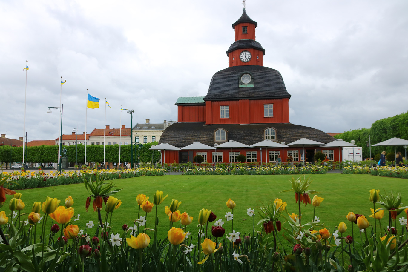 Rådhuset i centrala Lidköping. Lidköping vid Vänern, staden ligger nämligen intill den stora insjön – Sveriges största. Jag var där i en timme den 26 maj, sedan tog jag Västtåget till Hällekis station på Kinnekulle, sedan vandrade jag till Hellekis Säteri och till en restaurang i ett gammalt växthus intill för en måltid. Sedan efter den måltiden så kom jag att fortsätta hemvägen till Stockholm i från Råbäck station.