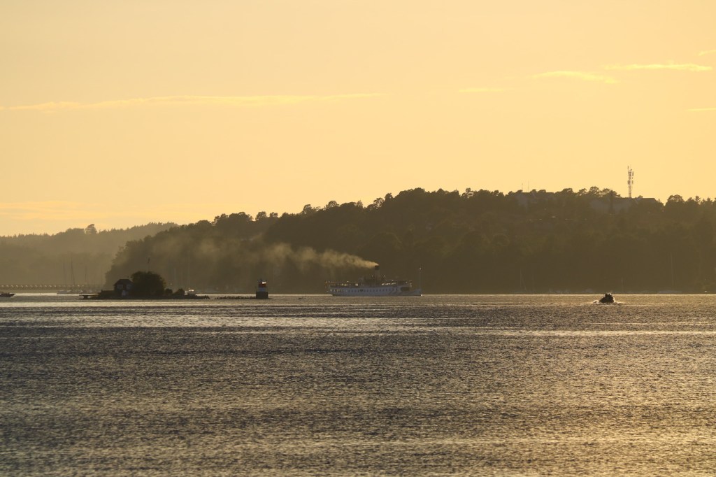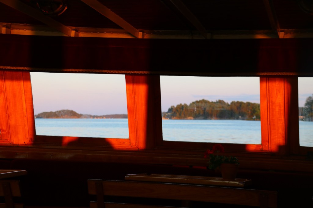 Nu styrde vi mot solen! Eller Skärgårdens huvudstad Vaxholm. Men här fanns det inte mycket att hämta förutom ett par resenärer, så när vi lämnade Vaxholm närmare 20:30 så var vi fem passagerare ombord! Besättningen är mer än det dubbla på ett ångfartyg av denna storlek med restaurang…