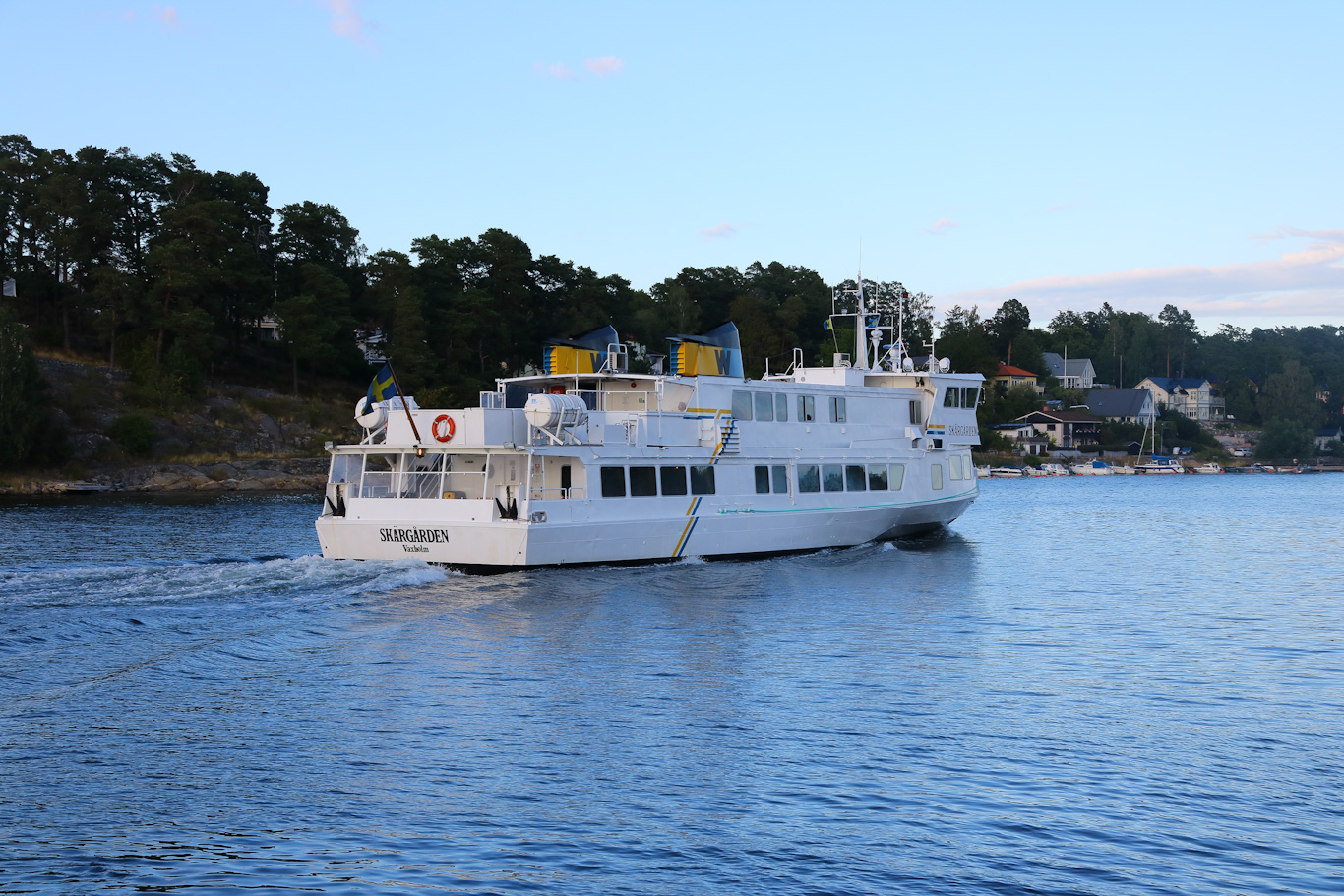 Skärgården lämnade Strömkajen klockan 17:30 på en av få avgångar på linje 83 under sommarsäsongen. Linje 83 är alltså en SL-linje och därmed betalar man med SL-taxa ombord, SL:s periodbiljetter eller reskassa. 83:an under sommaren kör vardagar eftermiddagar från Stockholm, och morgonavgångar vardagar till Stockholm. Jag reste med Skärgården ut till Ramsö brygga, linje 83 har sin slutbrygga – för jag säger inte hållplats – vid Rindö hamn, Grenadjärbryggan.