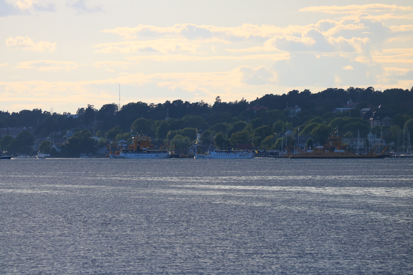Två vackra damer lämnar Vaxholm kl 19:00 – Strömmas Östanå I och Waxholmsbolagets Västan. Strömmas Östanå I som nu under senare delen av sommaren kör hela tre turer Stockholm-Vaxholm-Stockholm under namnet Lilla Skärgårdsturen.