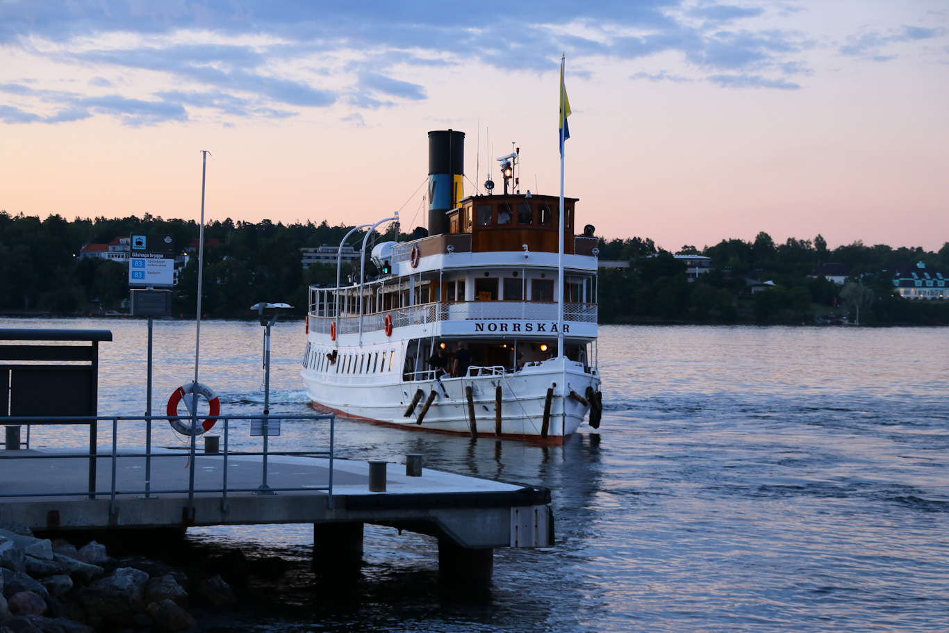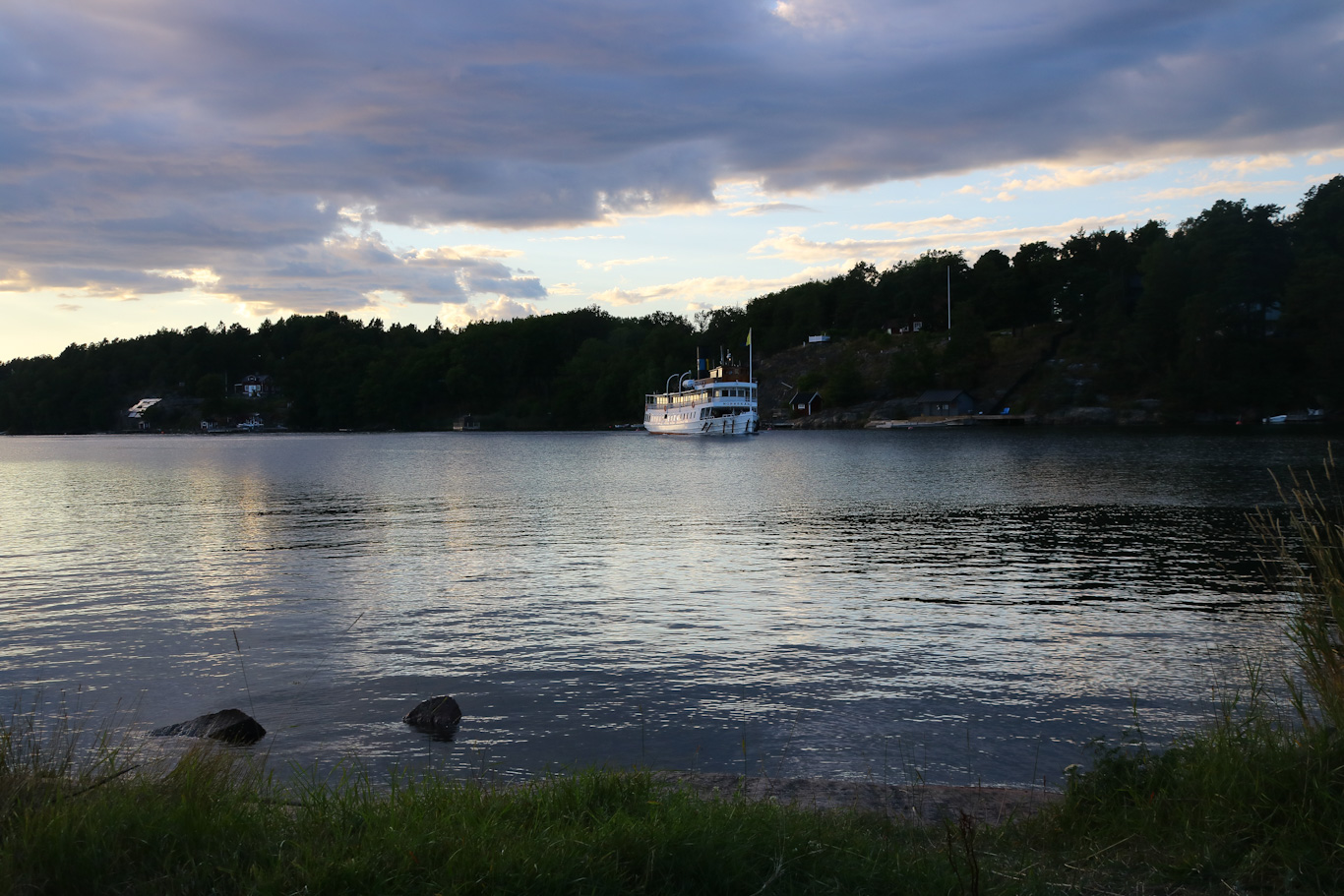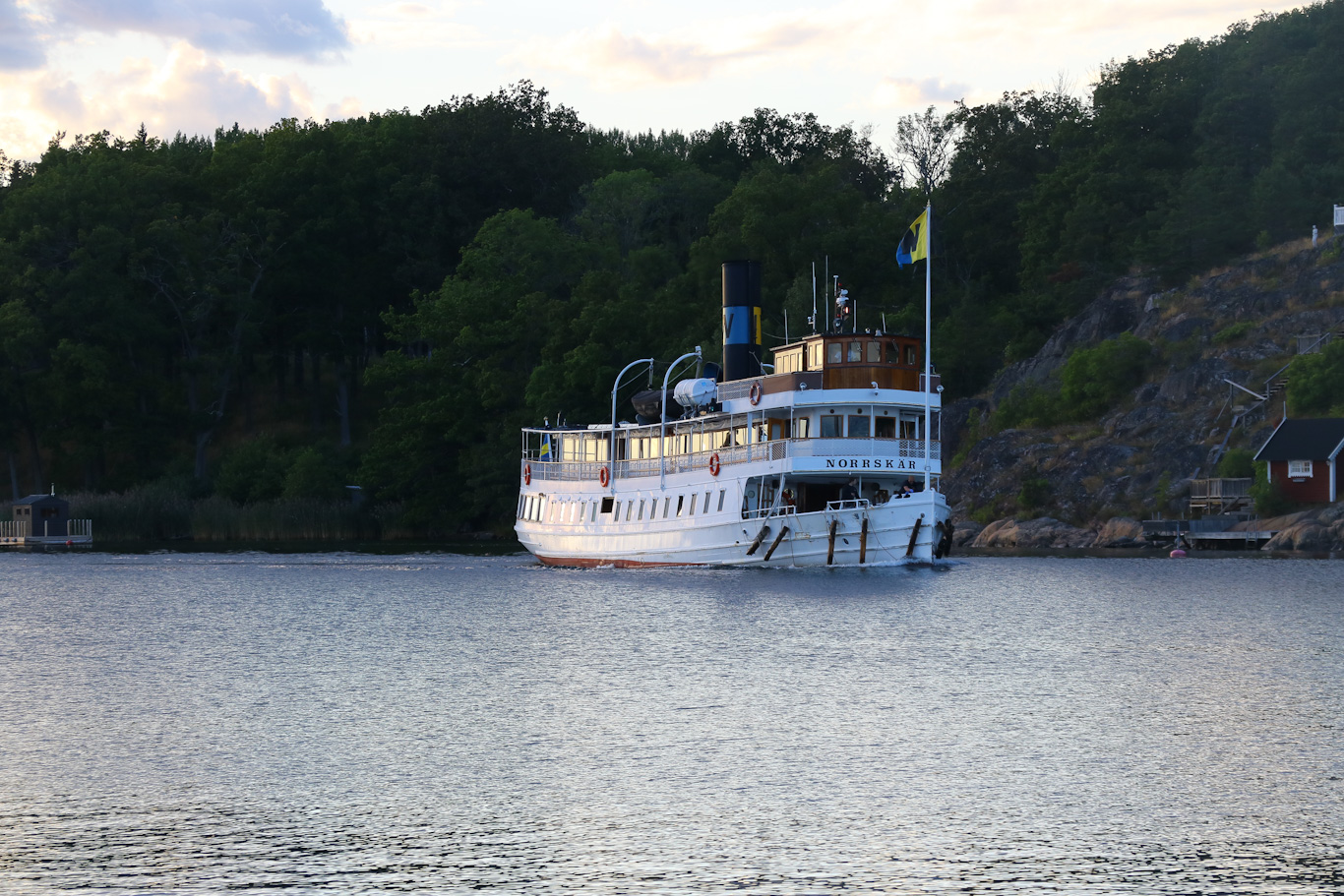 Jag tog en promenad ute på Ramsö, en kortare sådan, för att sedan kolla ångfartyget Norrskärs ankomst till bryggan. Hon kör ju under sommaren kvällsturer från Stockholm vardagar kl 18:00, som går ut till Vaxholm och Ramsö. Måndag-torsdag har hon 20 minuters uppehåll och drygt det ganska ofta, vid bryggan. Norrskär har ju en matsal med restaurang på övre däck, en vacker sådan med till och med vy föröver. Den här aftonen var det dock glest med matglada resenärer, ja matsalen såg till och med nedsläckt ut…