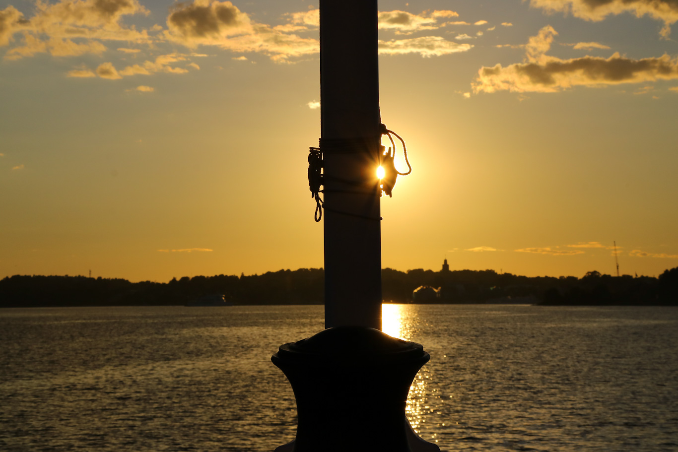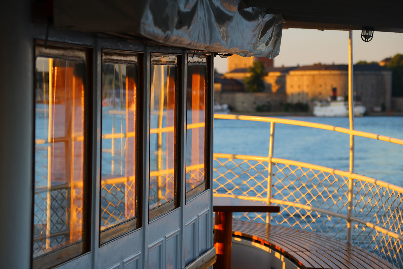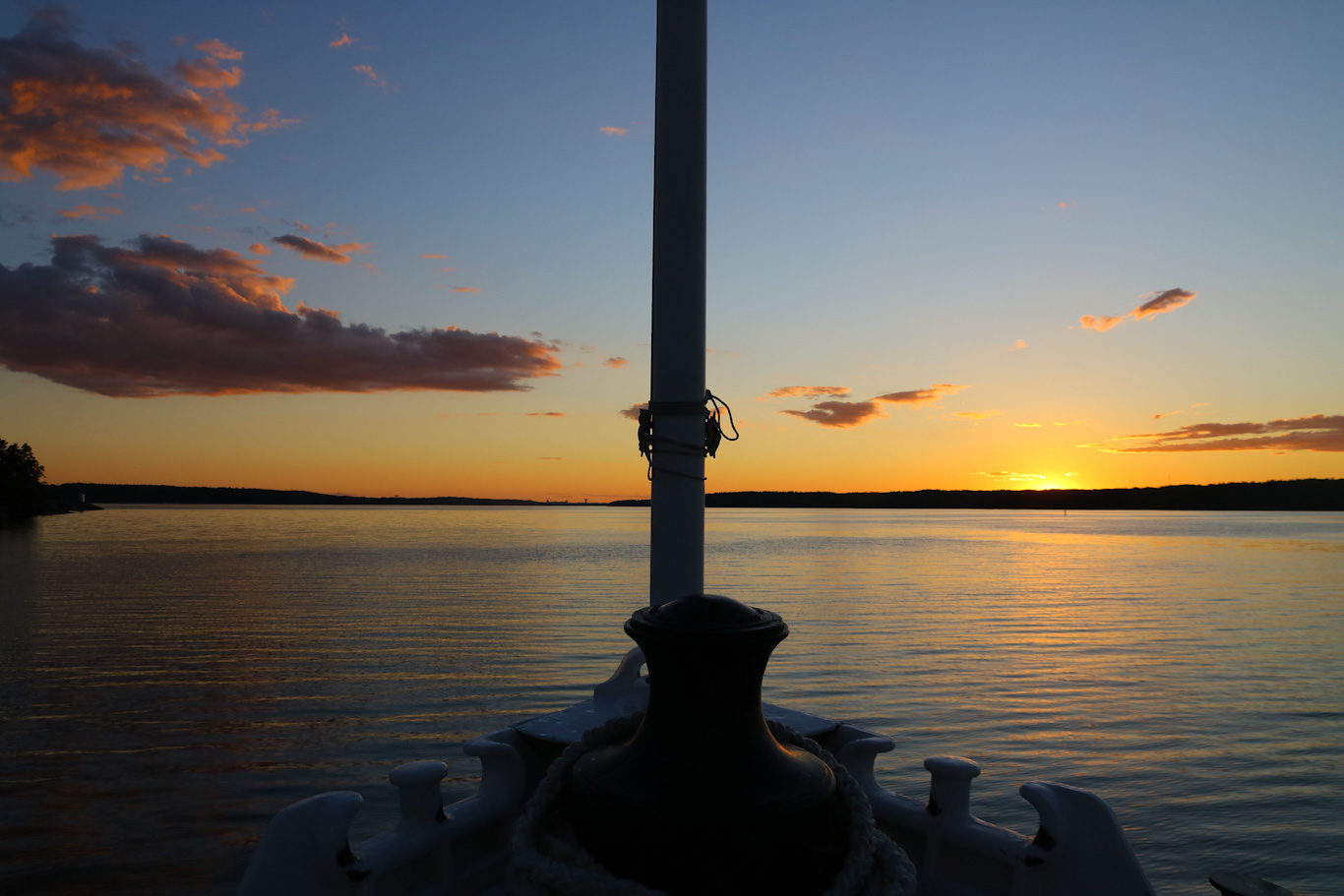 Nu styrde vi mot solen! Eller Skärgårdens huvudstad Vaxholm. Men här fanns det inte mycket att hämta förutom ett par resenärer, så när vi lämnade Vaxholm närmare 20:30 så var vi fem passagerare ombord! Besättningen är mer än det dubbla på ett ångfartyg av denna storlek med restaurang…
