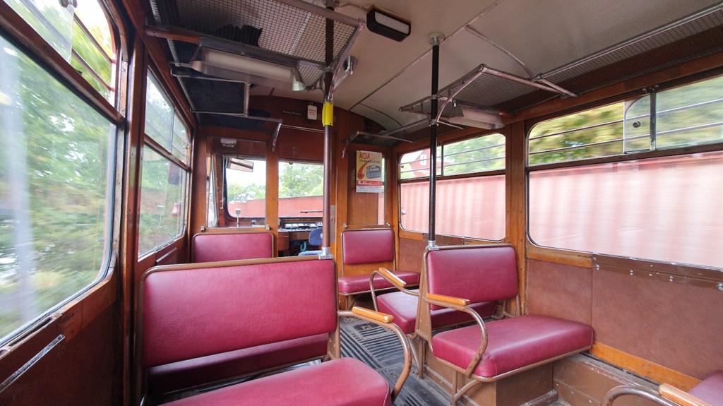 Efter att ha åkt en station med modern spårvagn mellan AGA och Skärsätra, så blev det därefter museispårvagn ut till Gåshaga. Just Lidingöbanan hade ju trafik med gamla vagnar länge, fram till juni 2013 så var det vagnar med ursprung från 1940-talet – även om de var ombyggda.