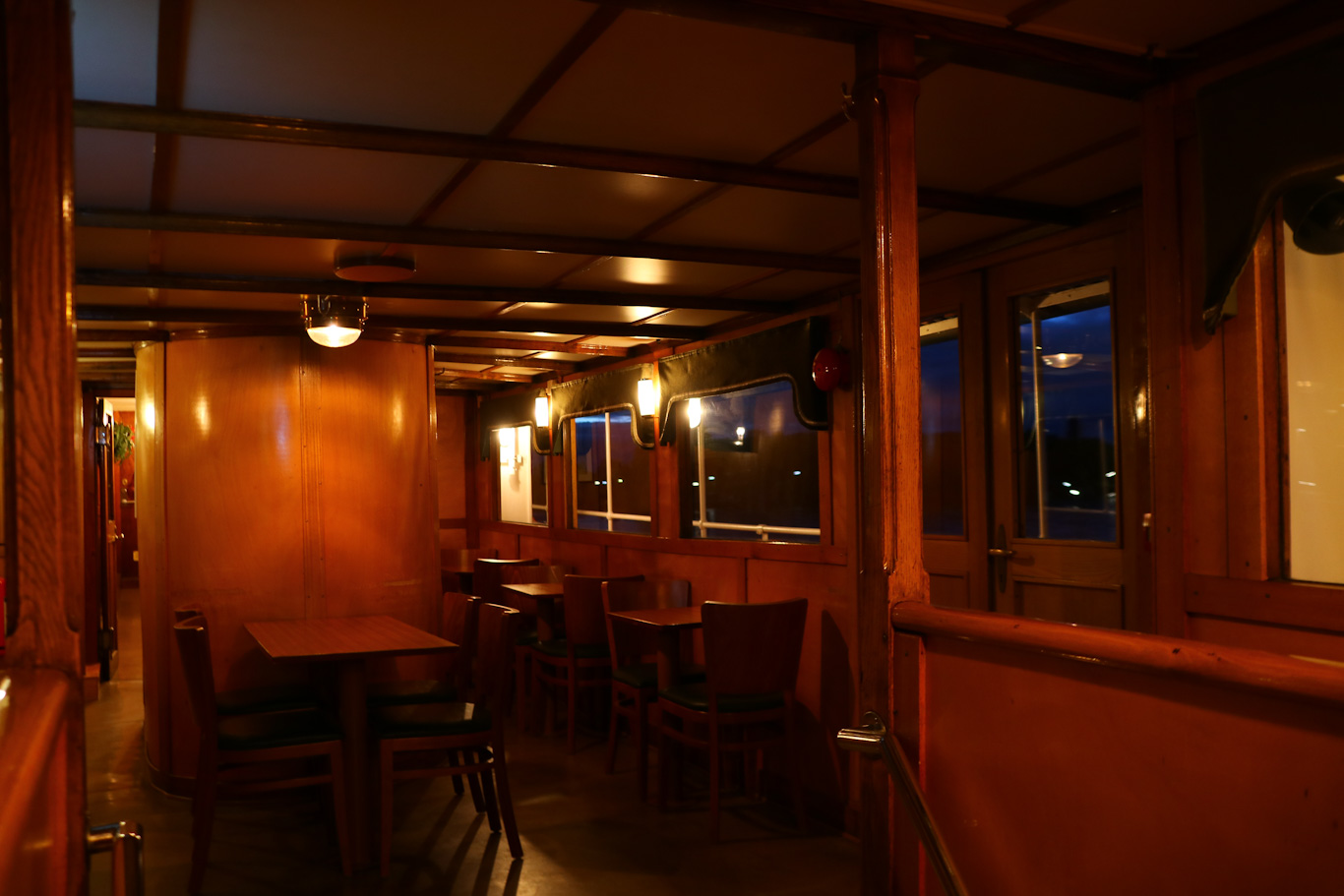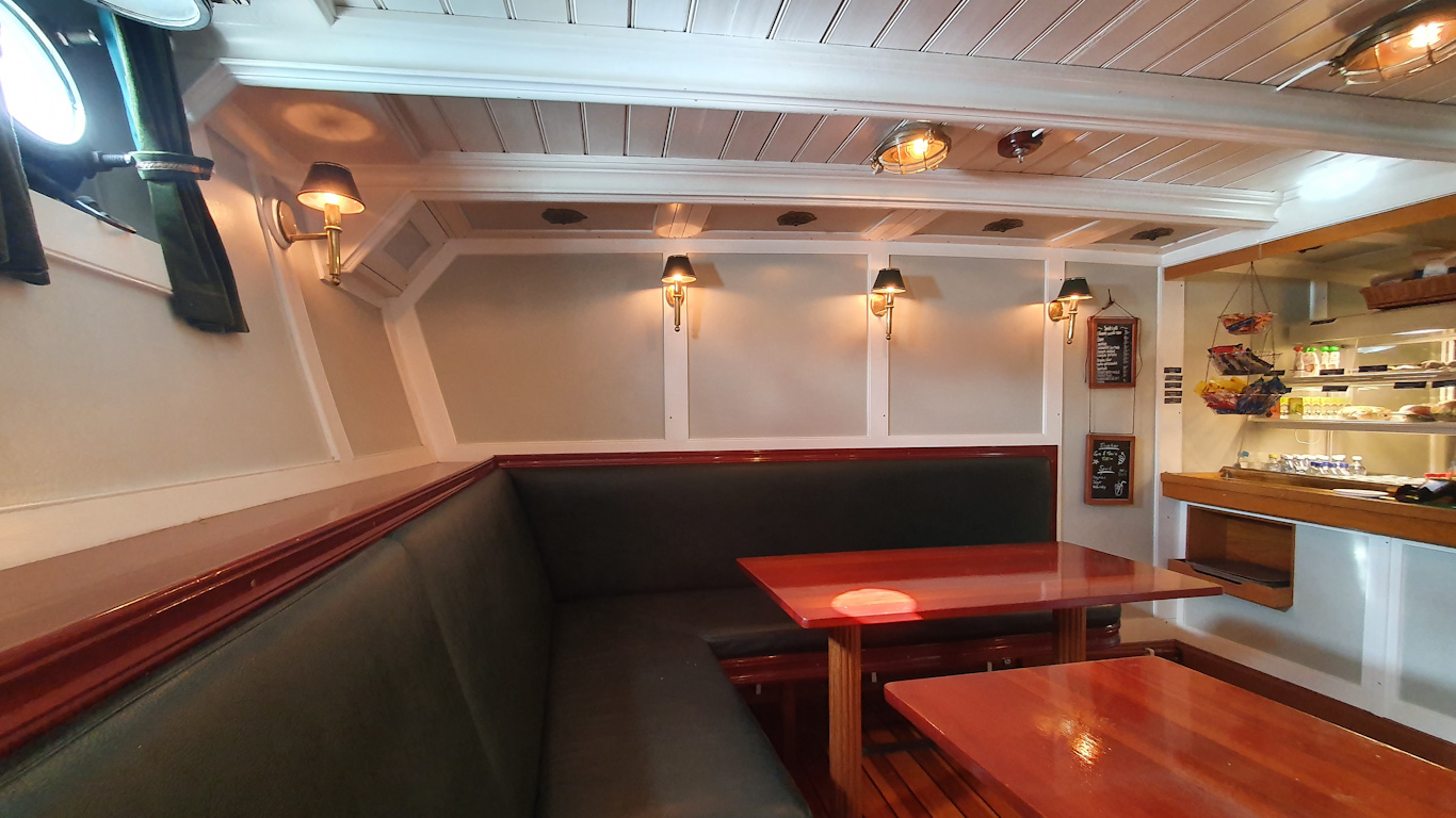 Från Gåshaga brygga togs ångbåten ut i skärgården. Storskär har under lördagar sommar och sensommar kört en trevlig tur ut till Möja. Går man en trappa ner från huvuddäck så finner man caféterian i fartygets försalong.