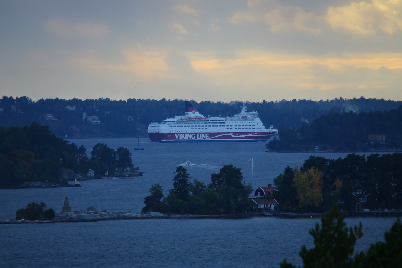 Ut på Trälhavet kom här då Amorella. Nu var det storzoomen på kameran som blickade in där färjan kom med Lindalssundet och ön Mansören i förgrunden.