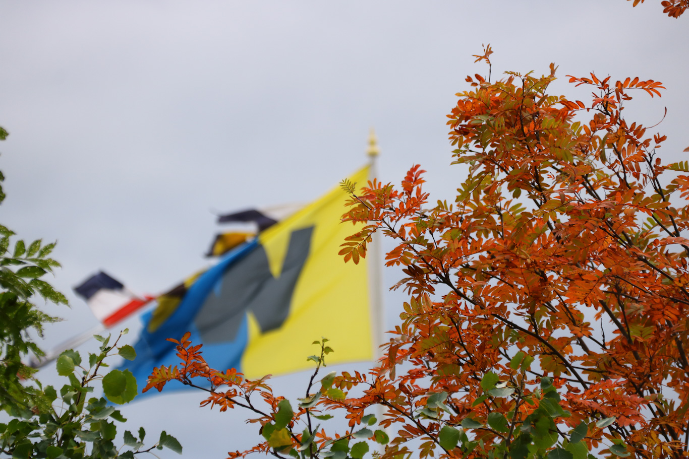 Vackra ting – Waxholmsbolagets rederimärke i Norrskärs gösstake, samt härliga höstfärger på en rönn.