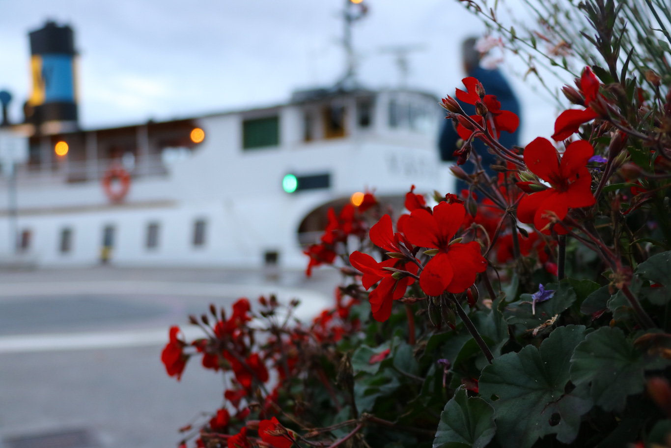Storskär fortsatte dock mot en annan by, Ramsmora, där det kom att vara en timmes paus. Här finns också lite service eller sevärdheter – förutom en fantastisk miljö vid Ramsmora brygga så finns Roland Svensson-museet och så Wikströms fisk som ligger en bit från bryggan men som serverar lokalt fångad fisk i en trevlig familjeägd restaurang. När det var dags för avgång kl 15:00 så blev det vinkningar från lokalbefolkning på bryggan och från ångbåten kom tre långa avskedssignaler.