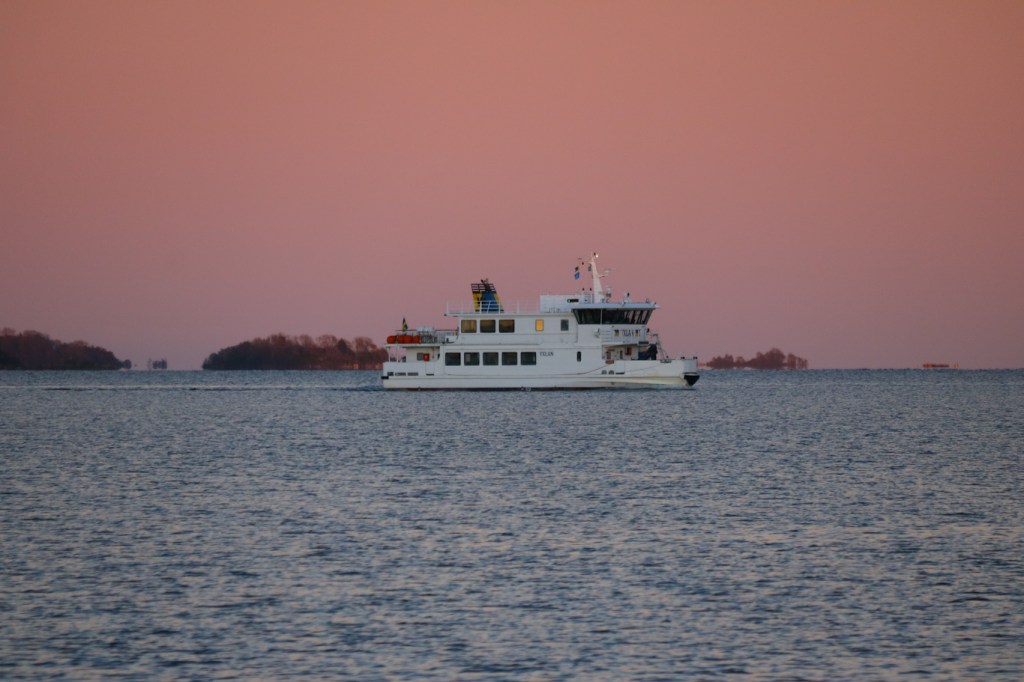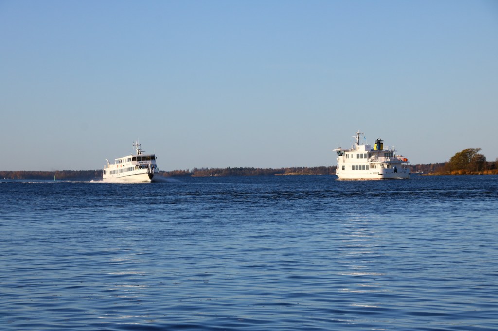 Mellan Blidö och Gräskö möttes m/s Yxlan som var ute på nästa tur från Furusund ut till Söderöra och Norröra. Det märktes att tiden dragits tillbaka en timme natten till söndagen med tanke på den begynnande skymningen redan klockan fyra när denna bild togs.