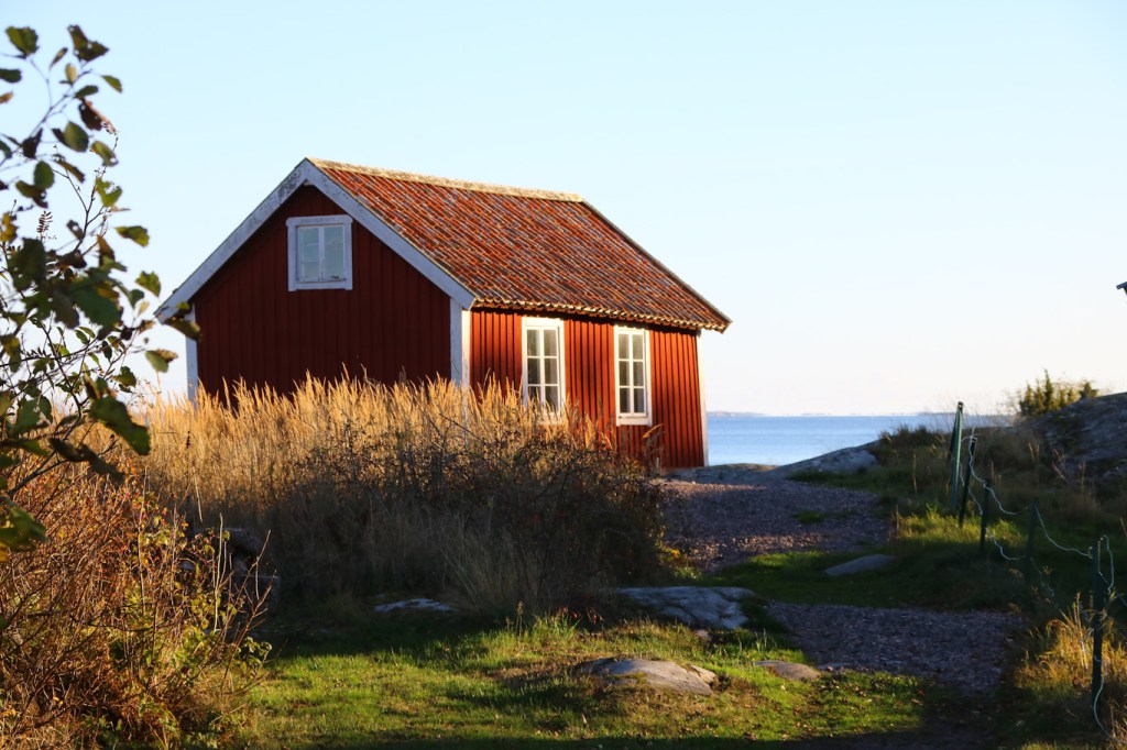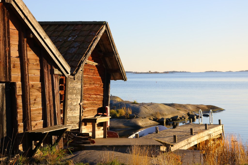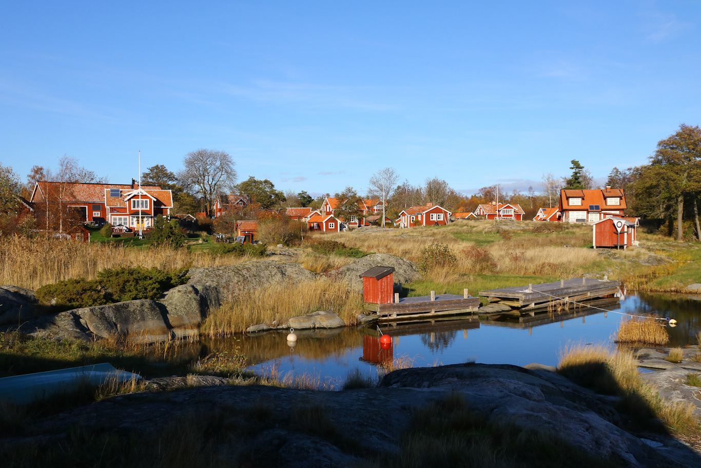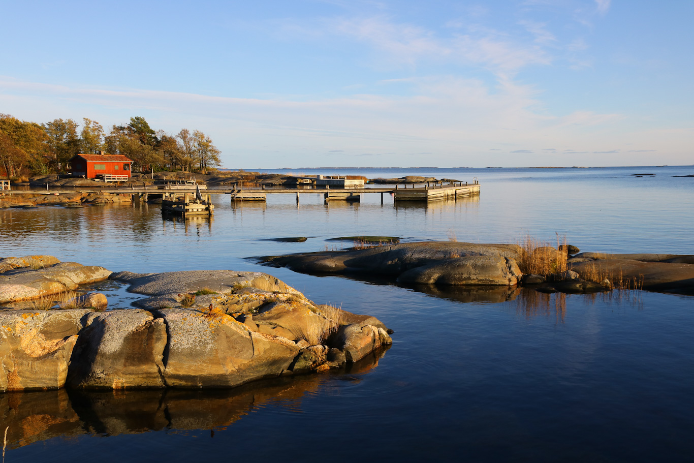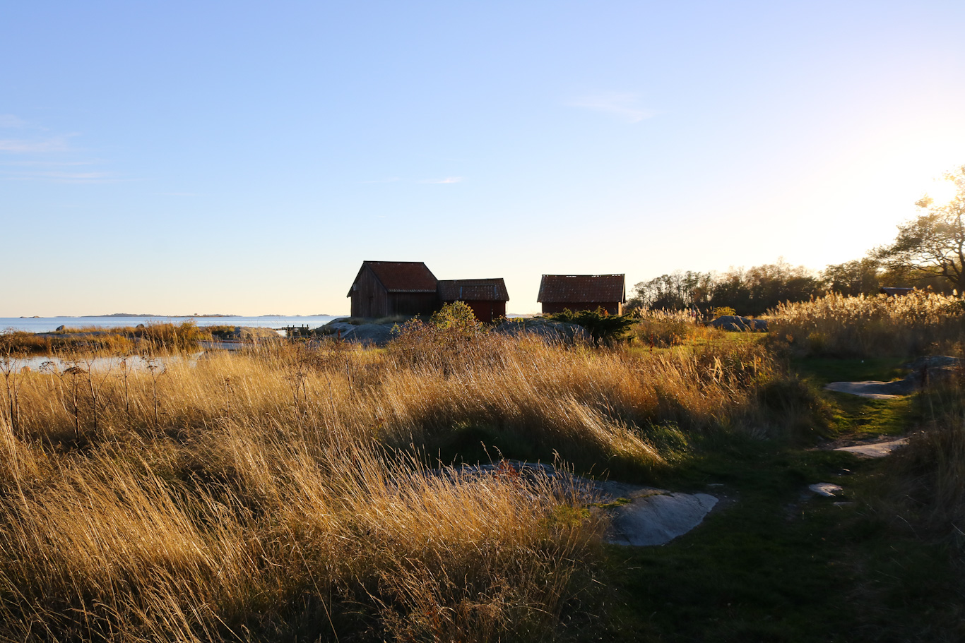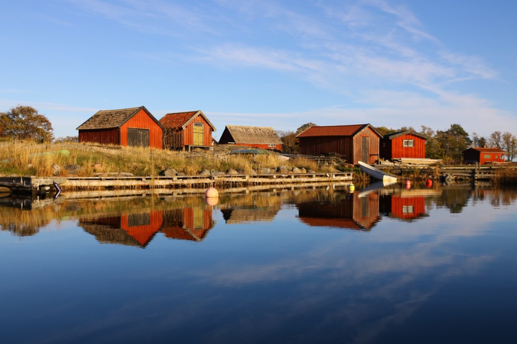 Sjöbodar i byhamnen i sent solljus och spegling – jo jag tackar jag.