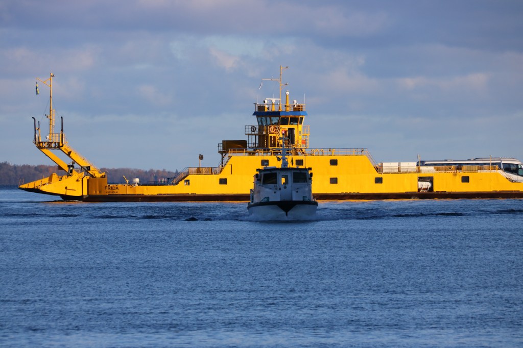 I skuggan av m/s Viking Cinderella så har m/s Skraken här en annan färja i bakgrunden, vägfärjan Frida.