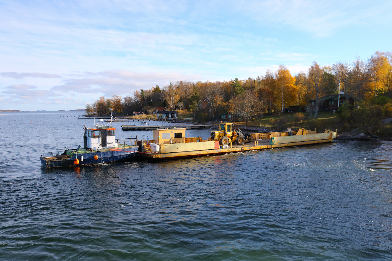 En arbetspråm som tidigare varit en linfärja med trafik mellan Oxnö och Arnö i Mälaren. Här ligger den vid Gräskö, en av öarna som ligger längs den stora farleden norr om Furusund.