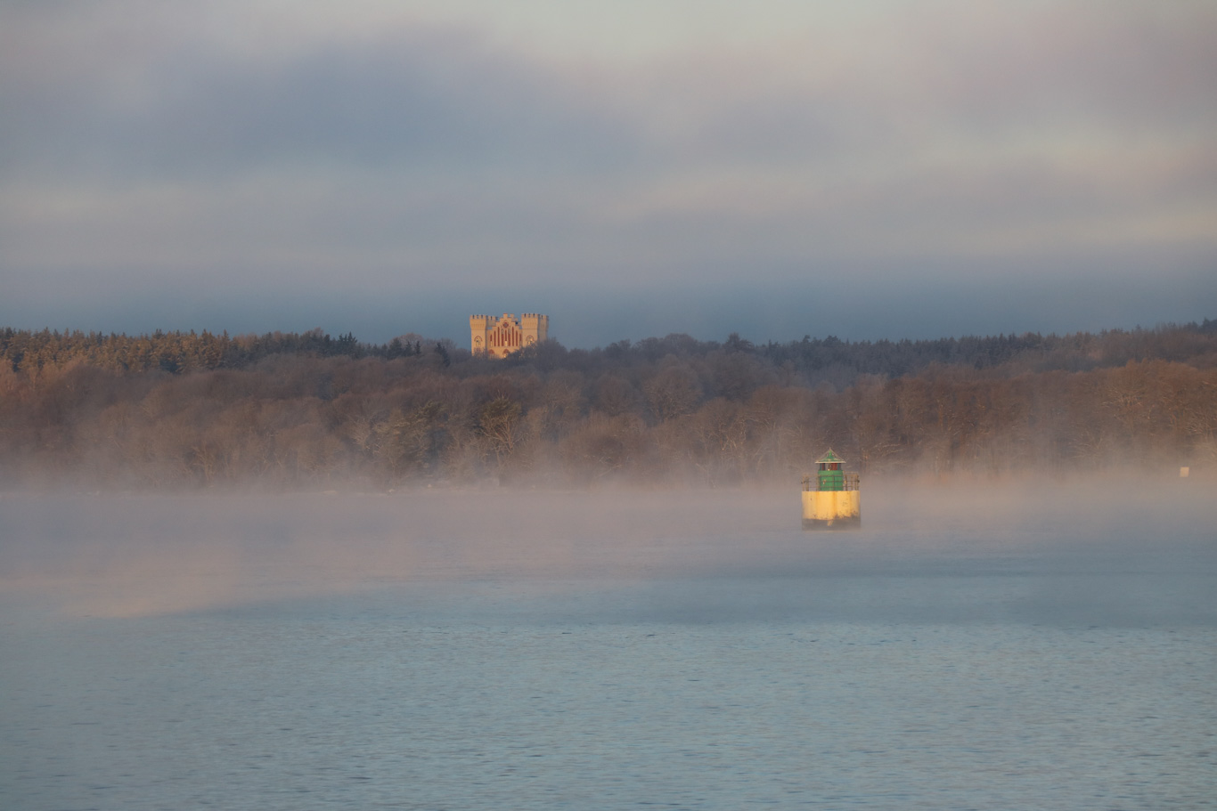 Variation med dimma ömsom solsken i Lindalssundet. Ön Vårholma till höger med en lustig mindre borgliknande byggnad på ett berg.