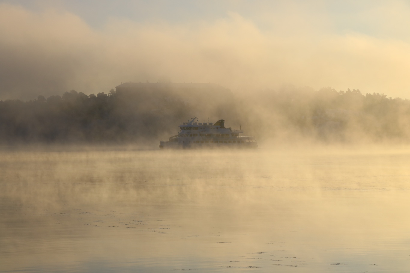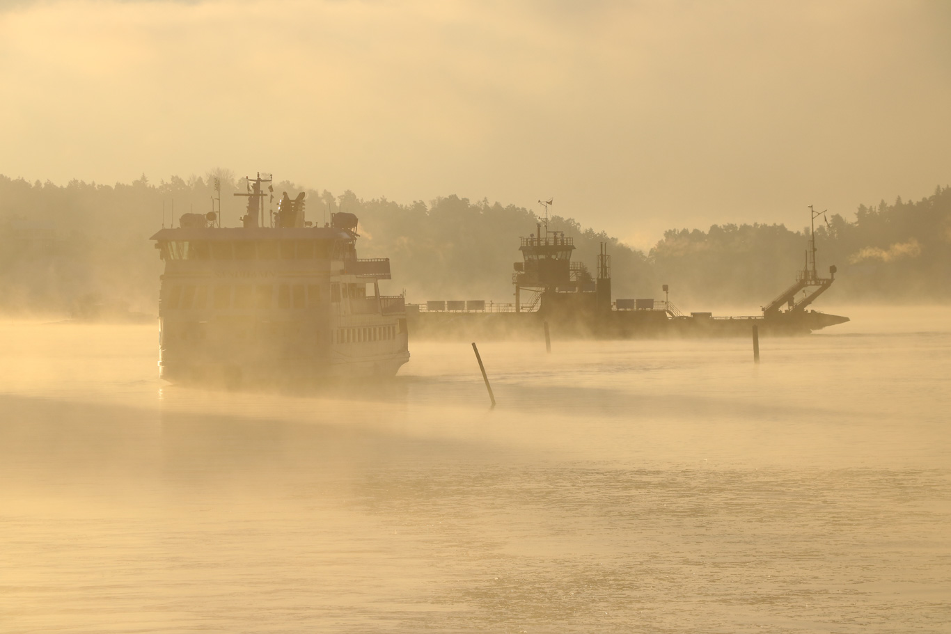 Sjöröken och dimman fortsatte. Här är det bara silhuetter av m/s Sandhamn och vägfärjan Nina. Den allmänna vägfärjan som kör på den knappa kilometerns färjeled mellan Vaxholm och Rindö.