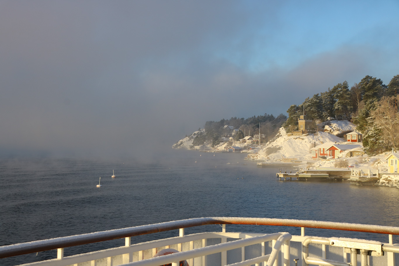 Utåt Höggarnsfjärden så låg timman tät, och på håll hördes de större färjorna in mot Stockholm ljudsignalera.