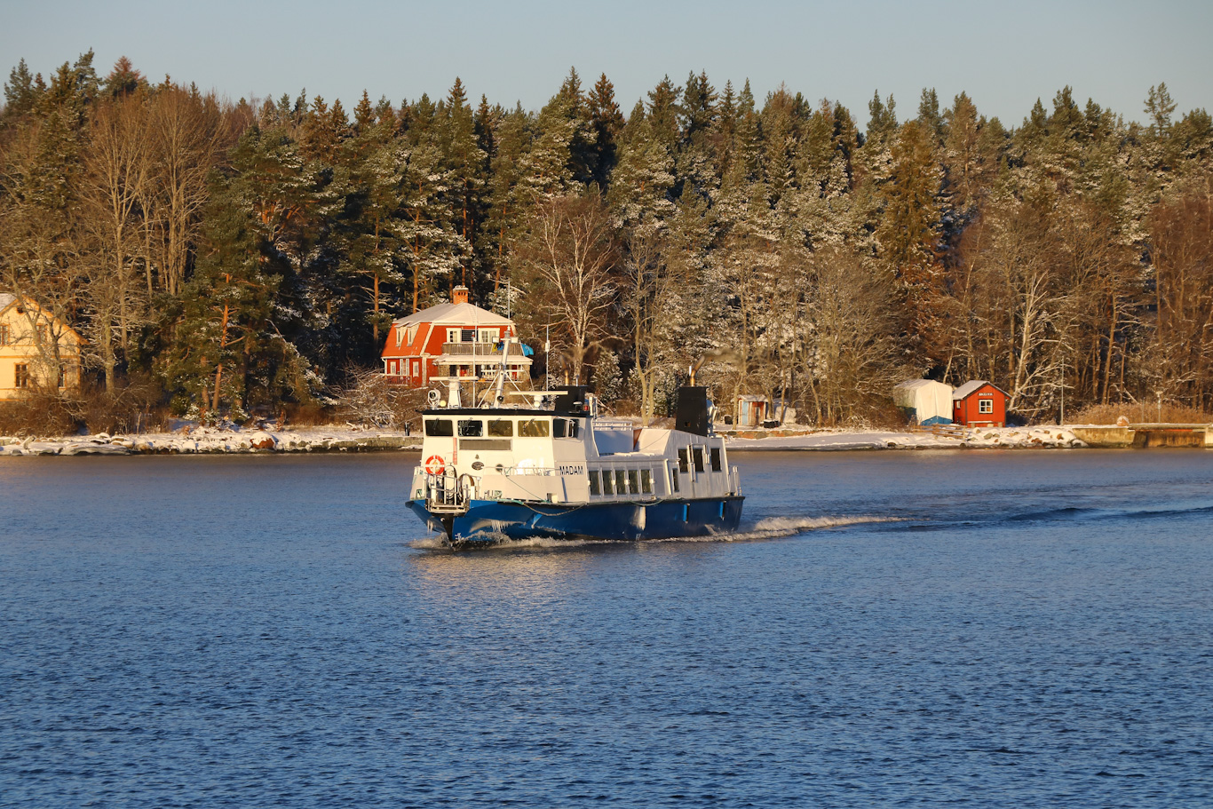 M/S Madam körde mellan Södra Ingmarsö och Boda, och har på bilden lämnat Skälvik på Svartsö. Normalt brukar båten m/s Nordan trafikera linjen som är en särskilt viktig vardagslinje mellan öarna utåt Svartsö-Ingmarsö och den fasta förbindelsen på Värmdö.