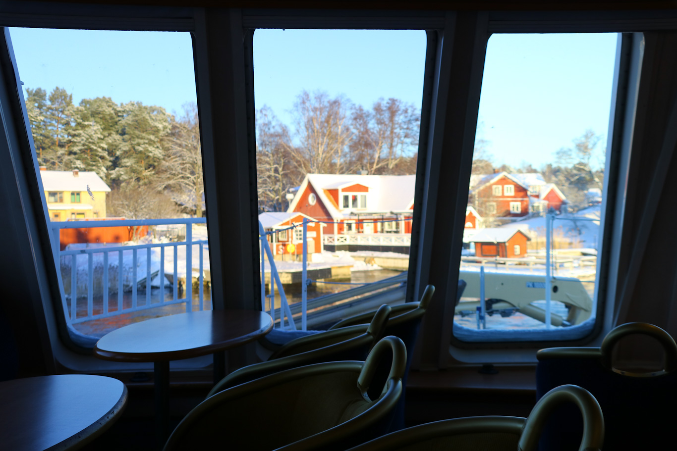 Södra Ingmarsö brygga skådad från den trevliga salongen föröver på övre däck.
