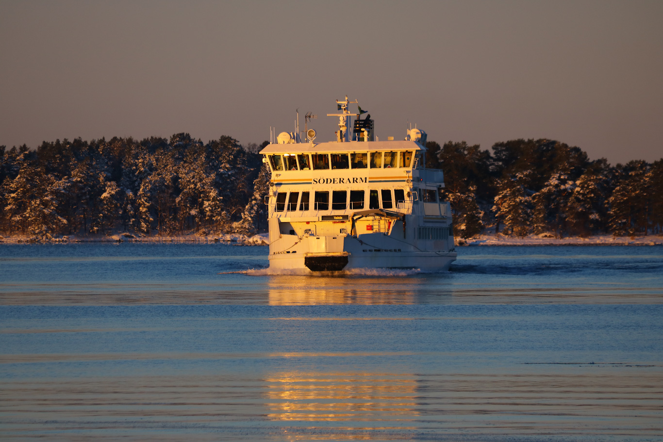 M/S Söderarm på väg in från Husarö där den fick ligga i alla fall 20 minuter innan tur påbörjades in mot Boda och Vaxholm. Vardagar kan det också finnas gods med ombord, vilket kan skapa förseningar beroende på hur mycket det är då detta ska hanteras vid bryggor. Det är ju de isförstärkta ”året runt”-fartygen som har dessa godskranar. M/S Söderarm har två systerfartyg – m/s Dalarö och m/s Sandhamn. De byggdes åren 2004-2005 och är Waxholmsbolagets största fartyg.